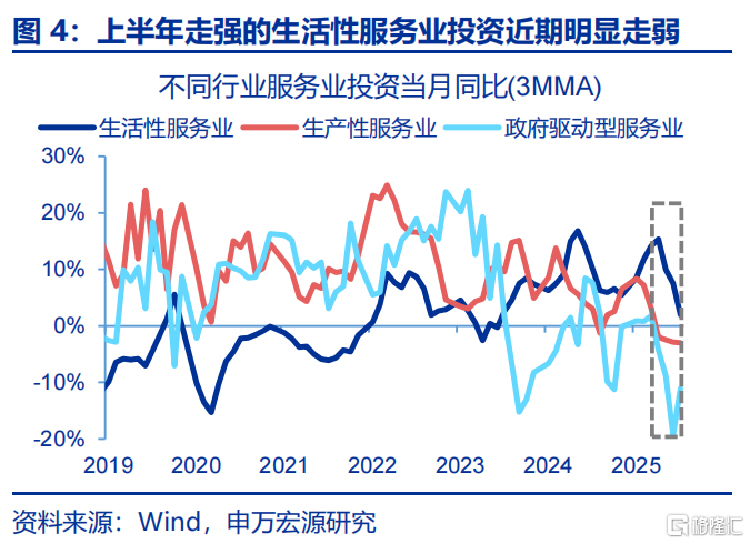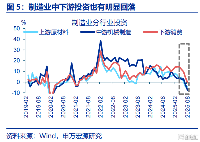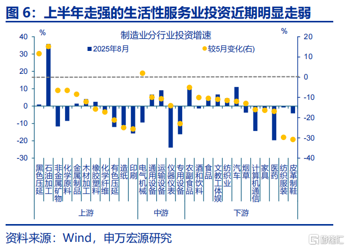 细分领域看,前期走强的重大工程、消费类基建、制造业投资近期均有明显下滑。基建投资中,重大工程与消费类基建投资均在下半年出现较大回落,如信息技术服务(-11.5pct至16.2%)、公用事业(-27.5pct至-2.4%)、设施管理业(-18.3pct至-14.6%)投资下半年来降幅在20pct左右;服务业投资(消费类基建)中,上半年冲高的生活性服务业投资在6月来也出现明显回落,至8月已下滑13.4pct至2%。制造业投资中,上半年维持10%以上增速的消费制造业8月投资回落至负区间,中游机械制造、上游原材料业投资在较低水平均有进一步下探,5-8月分别下滑10.4、8.8pct至-7.9%、-4.4%。