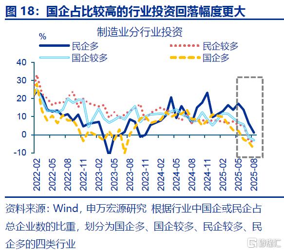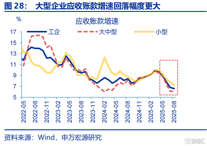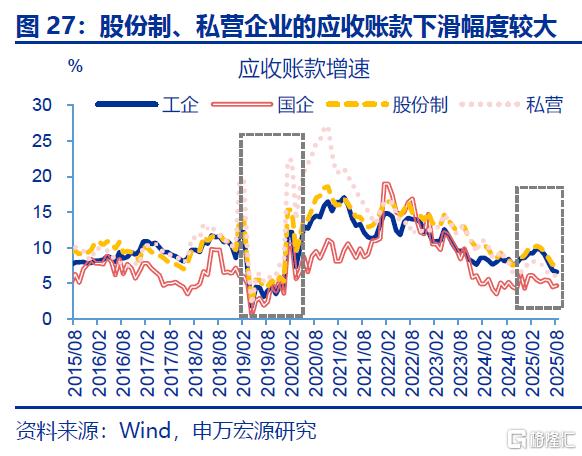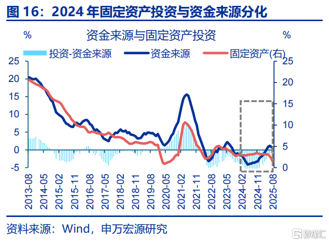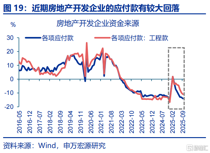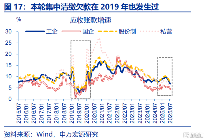 近两年部分企业以欠款形式增加投资,本轮化债除聚焦地方政府外,也要求企业加快清缴欠款,对投资产生额外拖累。自2024年以来,企业以欠款的形式扩张投资,表现为固定投资增速(3%左右)开始趋势性高于企业到位资金(自有资金与融资)增速(-3.3%左右),应收账款增速最高也上行至2025年3月9.9%。2025年4月国资委部署要求央企主动作为,确保即时付款;6月《保障中小企业款项支付条例》落地,强调机关、事业单位、大型企业拖欠中小企业款项不得超过60天;由于当前企业盈利偏弱,企业或将用于投资的资金清缴欠款,导致固定投资回落;2025年6月来应收账款增速回落2.4pct至8月6.6%,与固定投资回落的时点基本一致,也与2019年清缴中小企业欠款时类似。