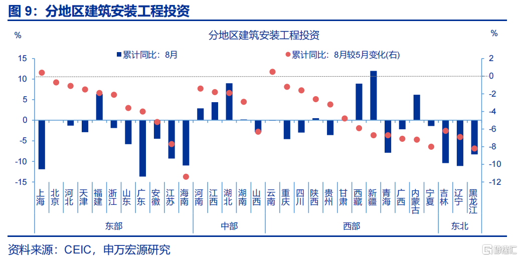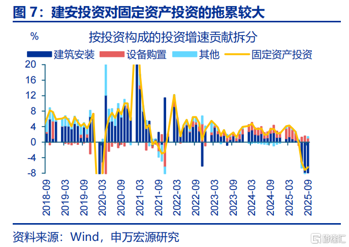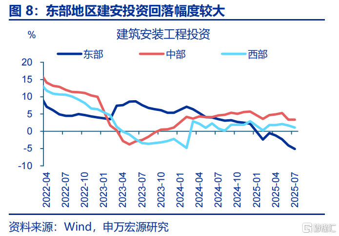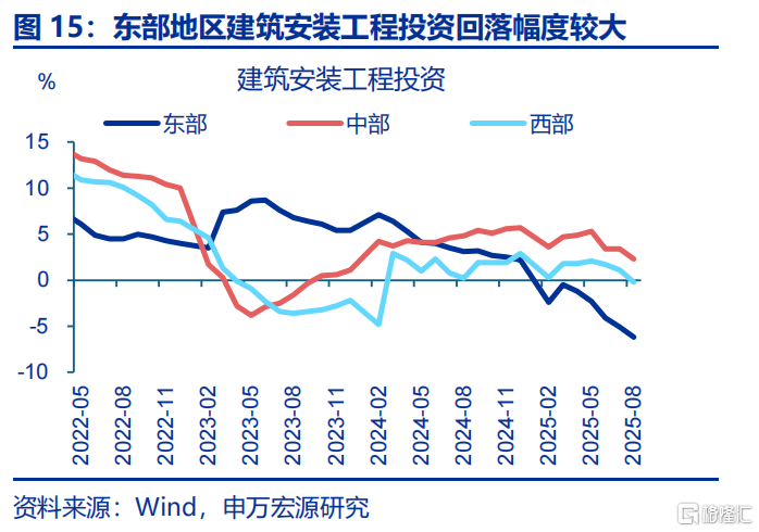 从投资构成看,建安投资下滑或是拖累固定资产投资回落的主因;区域上,东部地区的建安投资降幅更大。拆分投资构成的三大分项看,2025下半年以来建安投资回落16.4个百分点至9月-15.7%,拖累固定资产投资下滑8.4个百分点。区域上,东部地区建安投资回落幅度超过中西部,5-8月东、中、西部地区建安投资累计同比分别下滑3.9、3、2.3个百分点至-6.2%、2.3%、0.2%。具体地区中,海南(-11.9pct至-11%)、江苏(-13.4pct至-9.3%)、安徽(-10.8pct至-4.5%)等地建安投资回落幅度显著。
