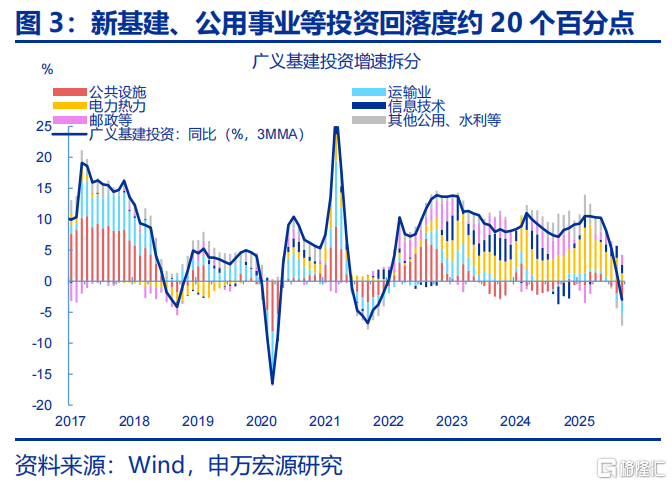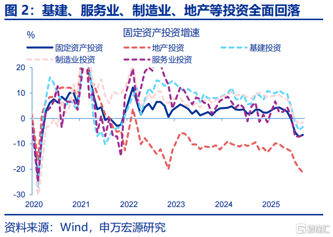 2025年下半年来,固定资产投资单月增速接近历史低位,其中四大类分项出现全面回落。2025年下半年来,固定资产投资增速大幅回落,自5月下滑9.2个百分点至9月-6.5%、接近五年最低点。剔除价格扰动后的实际投资增速回落幅度更为明显,期间已下滑7.8个百分点至-4.1%。拆分结构看,广义基建、服务业、地产、制造业投资出现全面下滑,下半年来四大类投资分别回落13.1、11.1、9.3、9.1个百分点至9月-3.3%、-6.6%、-21.2%、-1.5%。