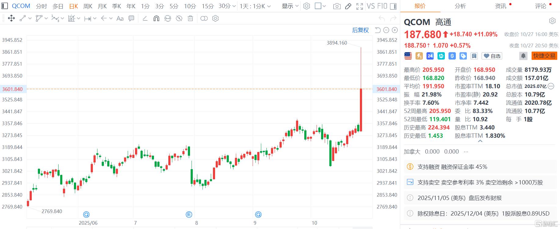 受消息提振,高通美股盘中一度狂拉近21%,创2019年以来最大日内涨幅。
