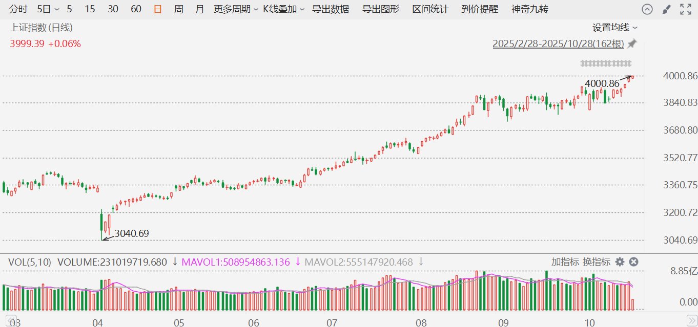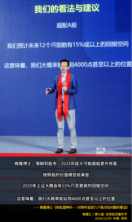 沪指突破4000点大关,为2015年8月以来首次。2024年12月5日,在深圳举行的格隆汇第九届全球投资嘉年华现场,格隆博士曾掷地有声地预言:“2025年A股市场极大可能面临意外惊喜,按照我的估值模型,2025年上证指数大概率会有15%乃至更高的回报空间,这意味着,我们大概率能站到4000点甚至以上的位置。”如今,这一预判正一步步成为现实。