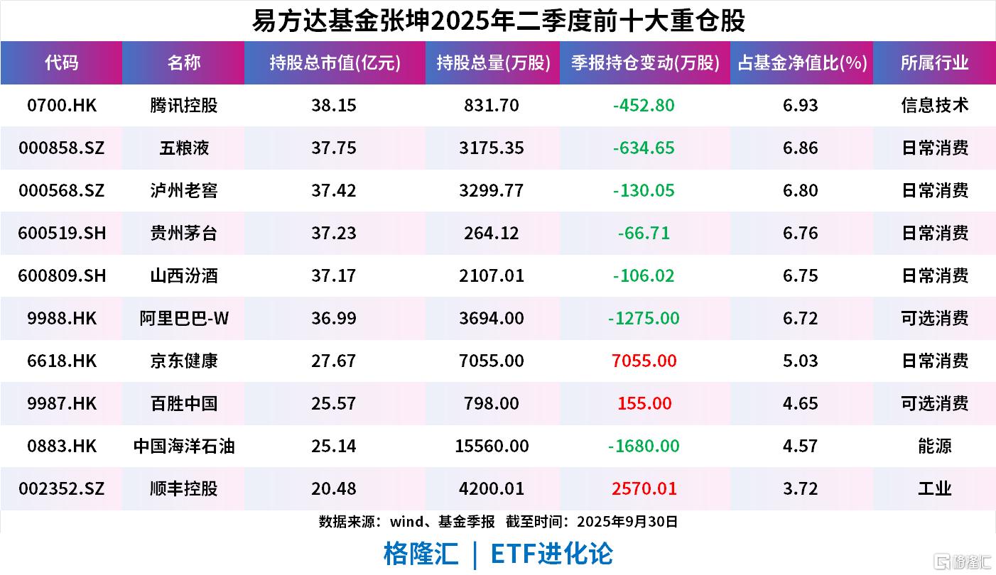 截至 2025 年三季度末,“顶流”基金经理易方达基金张坤管理的四只基金(易方达蓝筹精选、优质精选、优质企业三年持有、亚洲精选)均披露了最新前十大持仓。