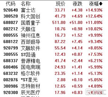 量子科技板块活跃,富士达涨近15%,科大国创、国盾量子、天融信、神州信息、西部超导等跟涨。