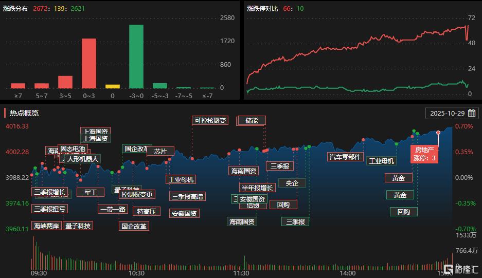 10月29日,A股主要指数高开高走,沪指涨0.7%报4016点,深证成指涨1.95%,创业板指涨2.93%,北证50指数涨8.41%。沪深两市成交额2.26万亿,较上一个交易日放量1082亿。