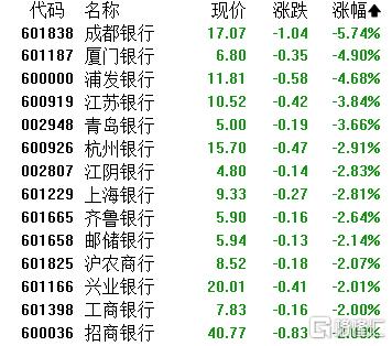 银行板块领跌,成都银行跌超5%,厦门银行、浦发银行、江苏银行、青岛银行、杭州银行等跟跌。