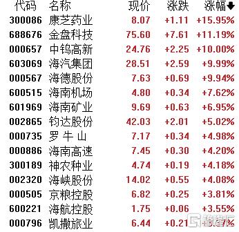 海南、海南自贸区板块强势,康芝药业涨近16%,中钨高新、海汽集团、海德股份涨停,海南机场、海南矿业、钧达股份等跟涨。