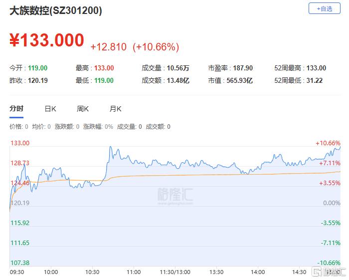 大族数控录得7连涨行情,收盘报133元,总市值565.93亿元。