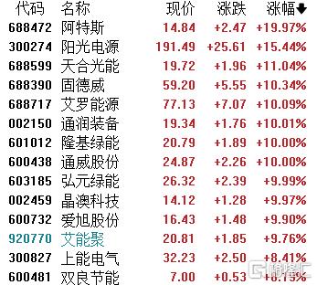 光伏设备板块走强,阿特斯20CM涨停,阳光电源涨超15%,天合光能、固德威、艾罗能源、通润装备、隆基绿能、通威股份等跟涨。