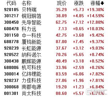 电池板块活跃,贝特瑞涨超19%,铜冠铜箔、先导智能、科力远、中一科技、厦钨新能、长虹能源、纳科诺尔、鹏辉能源等跟涨。
