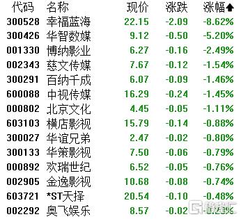 影视院线板块下挫,幸福蓝海跌超8%,华智数媒、博纳影业、慈文传媒、百纳千成、中视传媒、北京文化、横店影视等跟跌。