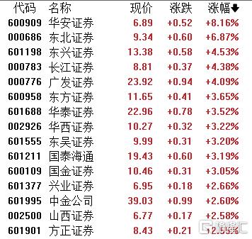 证券板块上涨,华安证券涨超8%,东北证券、东兴证券、长江证券、广发证券、东方证券等跟涨。
