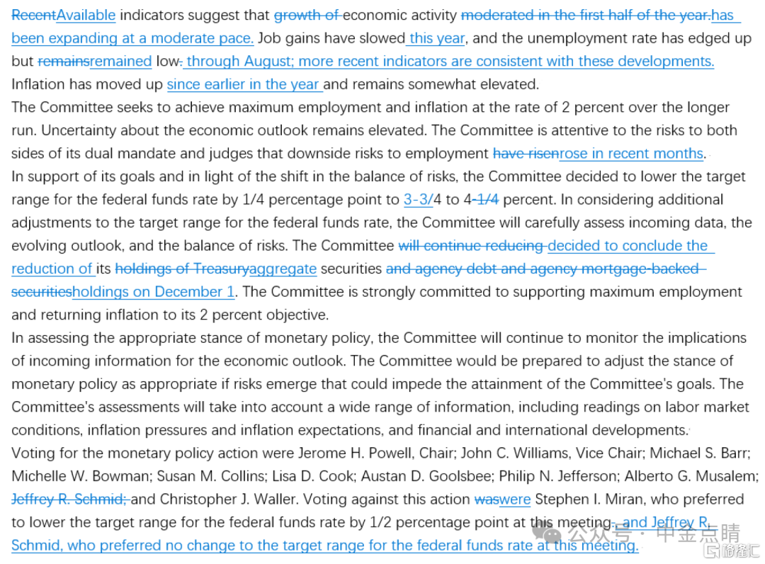 图表2:美联储货币政策声明对比(2025年10月vs 2025年9月)