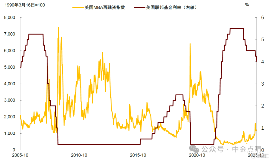 同时,对降息刺激效果的预期也应保持谨慎。降息影响经济的一个渠道是“再融资效应”——当利率下降时,房贷持有人可以通过再融资以降低还款成本,从而提升可支配收入并刺激消费。但自2024年降息以来,这一效应明显有限。一个佐证是,美国抵押贷款银行家协会(MBA)的再融资指数并未像过去的降息周期那样显著上升。其主要原因在于,大量购房者已在2021年锁定了超低利率,因此缺乏再融资的动力。宏观层面看,这意味着本轮降息对房地产市场以及利率敏感型消费的拉动作用或将弱于以往周期,本轮金融周期的上行幅度也将低于过去两轮金融周期。