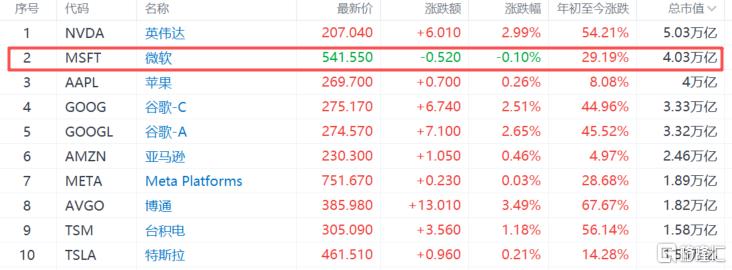今年迄今,微软股价累计上涨了约27%,现总市值4.03万亿美元。