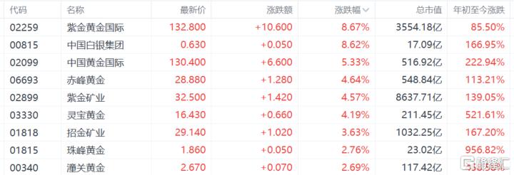 黄金及贵金属大涨,紫晶黄金国际、中国白银集团涨超8%,中国黄金国际涨超5%,赤峰环境、紫金矿业涨超4%。世界黄金协会发布数据称,2025年三季度全球黄金需求总量(包含场外交易)同比增长3%达1313吨,创下单季度黄金需求的最高纪录;需求总金额同比增长44%达1460亿美元,也创下历史新高。