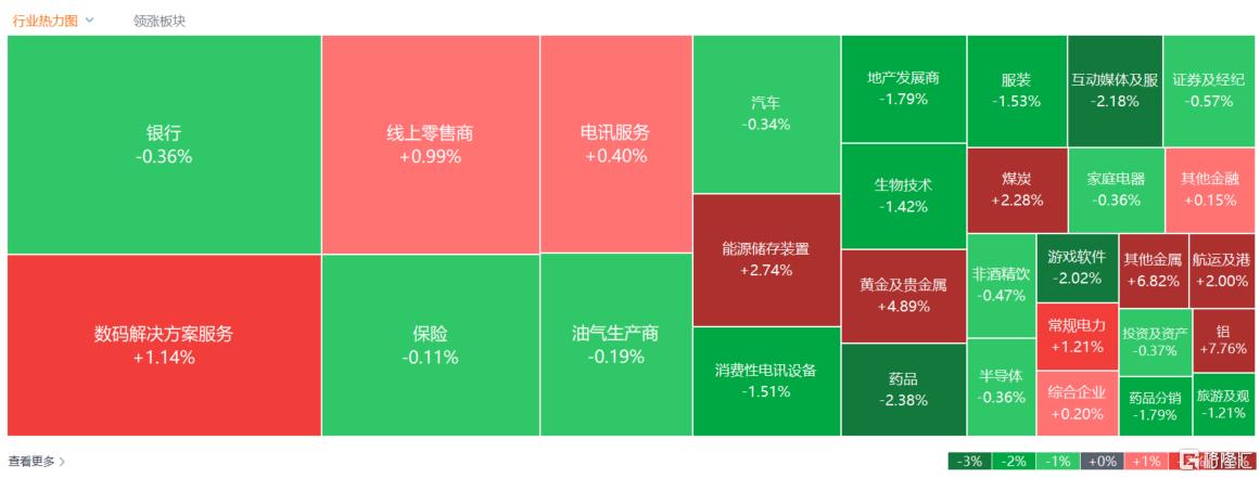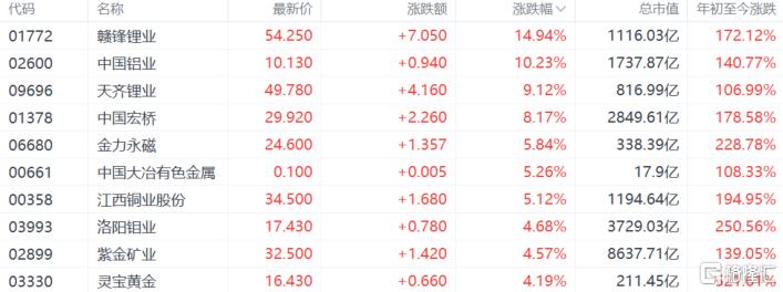 盘面上,大型科技股走势明显分化,铜业股、黄金股领衔有色金属股上涨,锂电池板块全天表现强势,赣锋锂业业绩超预期大涨近15%领衔;煤炭股、港口及海运股、光伏股、核电股、家电股、建材水泥股多数活跃。内房股集体弱势,苹果概念股、体育用品股、啤酒股、餐饮股等消费类股多数低迷。