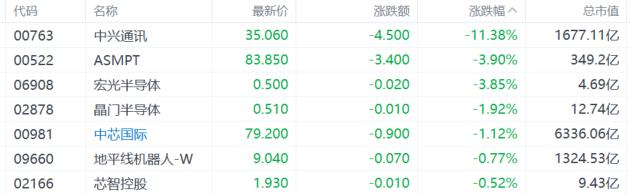 半导体、芯片股跌幅居前,中兴通讯大跌超11%,宏光半导体跌超3%,晶门半导体、中芯国际跌超1%。