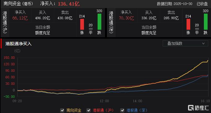此外,南下资金大举抄底净买入超110亿港元。其中,港股通(沪)净买入66.12亿港元,港股通(深)净买入70.3亿港元。