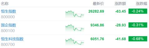 截止收盘,恒生指数跌0.24%,国企指数跌0.31%,恒生科技指数跌0.68%。