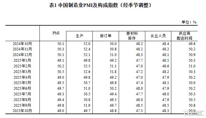 一、10月制造业采购经理指数为49.0%