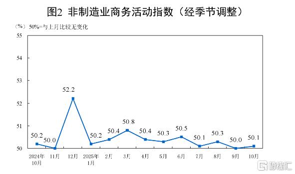 10月份,非制造业商务活动指数为50.1%,比上月上升0.1个百分点,升至扩张区间。