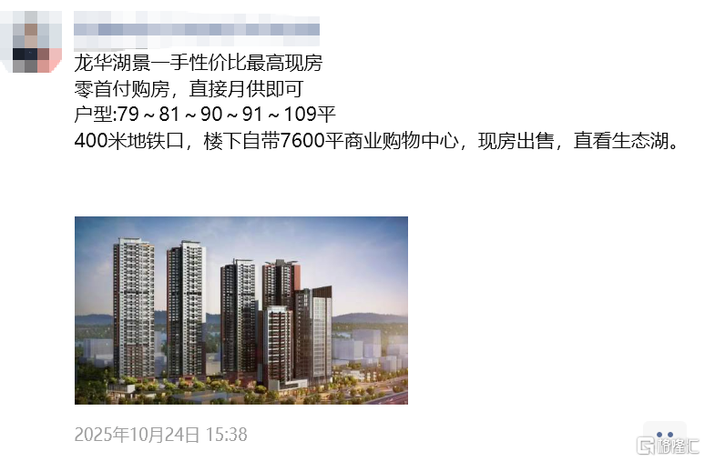 比如位于龙华大浪的锦顺名居,朋友圈推广“零首付购房,直接月供即可”。