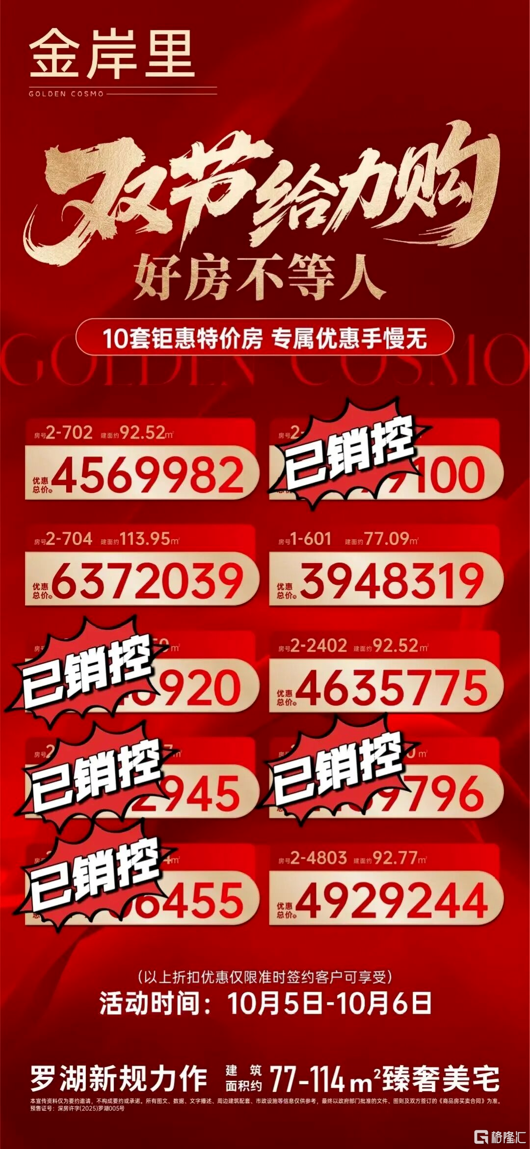 国庆期间也做了促销,拿出10套房源进行大幅让价,比如2-704的约113.95平户型,原备案价约761万,优惠价约637.2万,降价约123.8万,比如2-702的约92.52平户型,原备案价约546万,优惠价约457万,降价约89万。