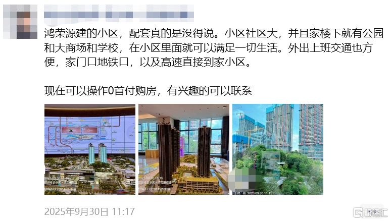 而位于宝安沙井的鸿荣源珈誉府,则出现“买房只需交一个定金,其余首付第三方免息用一年”的情况。