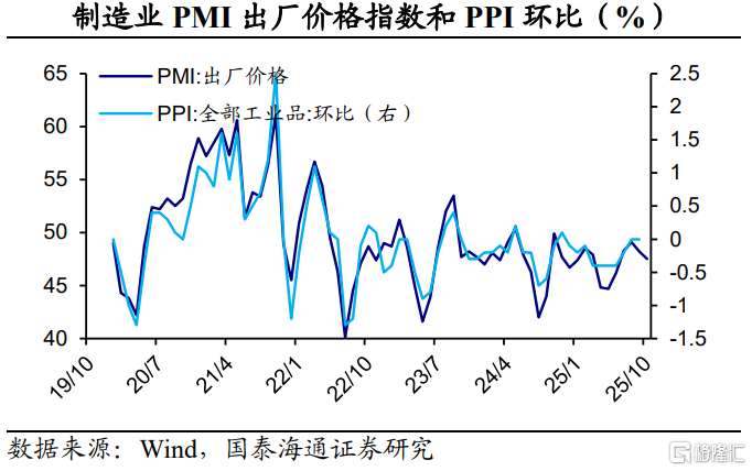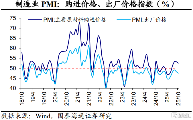 价格指数边际下降。2025年10月份,主要原材料购进价格指数和出厂价格指数分别为52.5%和47.5%,均比9月下降0.7个百分点。我们的理解是,外需波动对价格形成拖累。