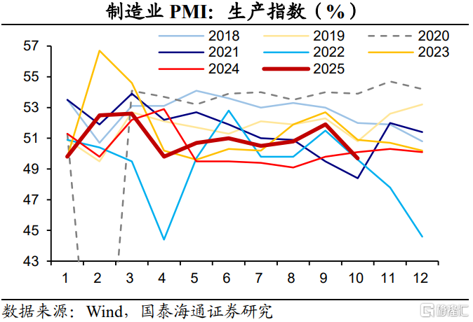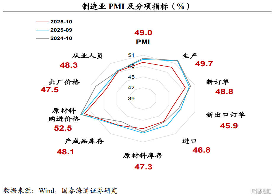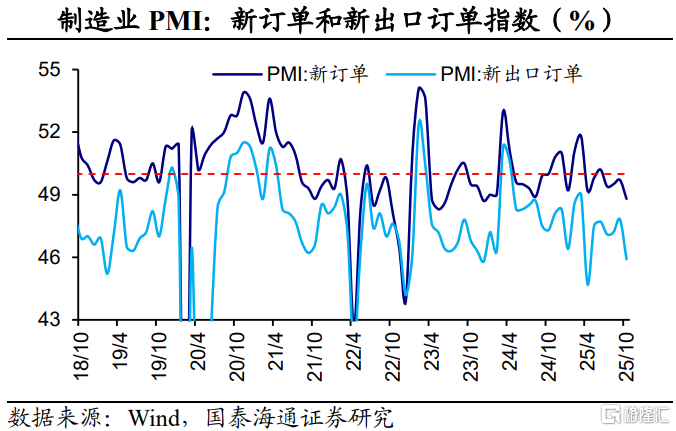 新出口订单、生产指数回落,主因外部因素扰动。2025年10月份,新订单指数为48.8%,比上月下降0.9个百分点。其中,新出口订单指数为45.9%,比上月47.8%下降1.9个百分点。外部环境的波动对本月需求形成扰动。这也使得企业生产决策保持谨慎。2025年10月份,生产指数为49.7%,比上月下降2.2个百分点。