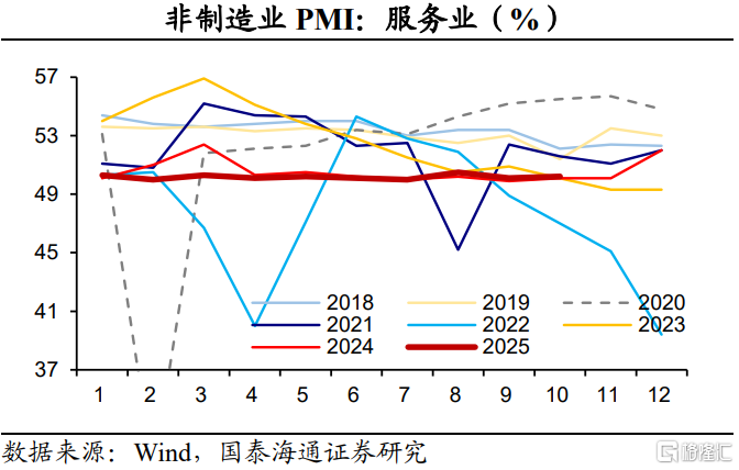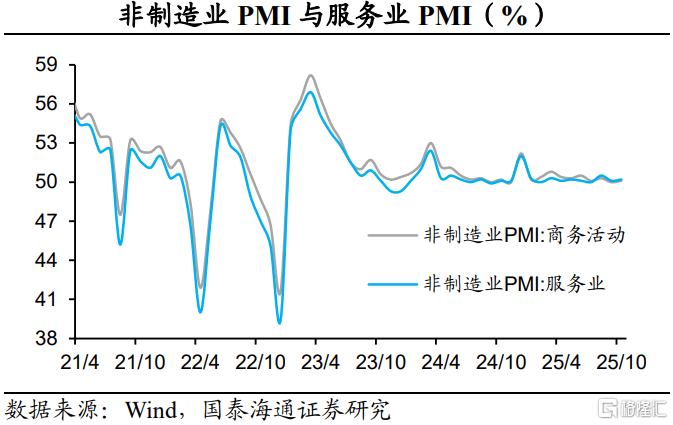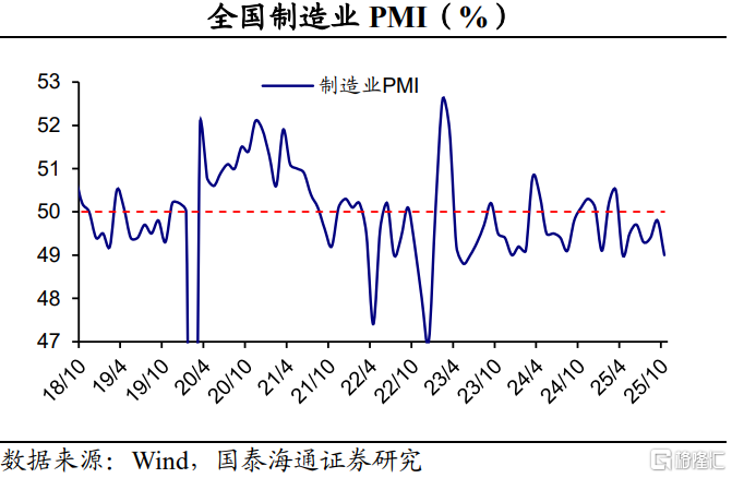 2025年10月份,制造业PMI为49.0%,比上月下降0.8个百分点。建筑业商务活动指数为49.1%,比上月下降0.2个百分点;服务业商务活动指数为50.2%,比上月上升0.1个百分点。