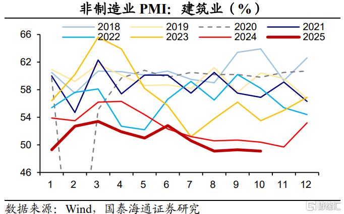 建筑业景气度略降,降幅弱于季节性。2025年10月份,建筑业商务活动指数为49.1%,比上月下降0.2个百分点。值得关注的是,政策端对基建项目的支持或边际提升。第一,2025年10月份,5000亿元新型政策性金融工具完成投放,预计可拉动项目总投资超7万亿元。从投向看,数字经济、人工智能、消费等领域项目获得重点支持。第二,近期,中央财政从地方政府债务结存限额中安排5000亿元下达地方,总规模较上年增加1000亿元,除了补充地方财力、化解债务、偿还欠款外,还用于项目建设。第三,财政部将提前下达2026年新增地方政府债务限额,支持重点项目2026年一季度建设资金需求。