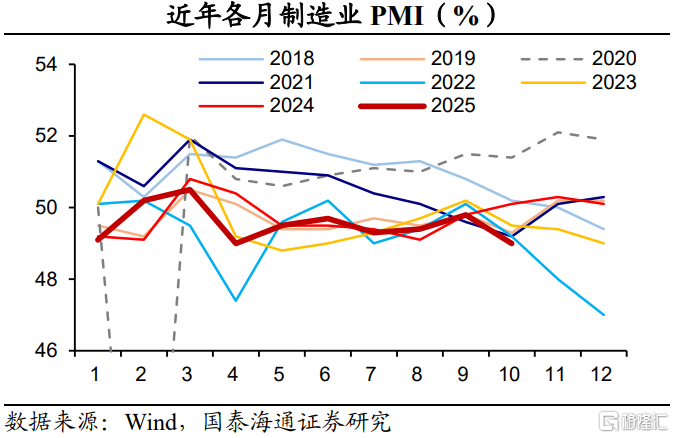制造业PMI边际回落。2025年10月份,制造业采购经理指数(PMI)为49.0%,比上月下降0.8个百分点。本月制造业PMI低于过去几年同期水平,降幅强于季节性。究其原因,外部因素扰动,外需指数有所拖累,同时国内企业在采购、生产方面保持谨慎。这一点从小型制造业企业的PMI的回落也有所反映。