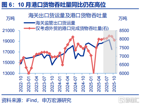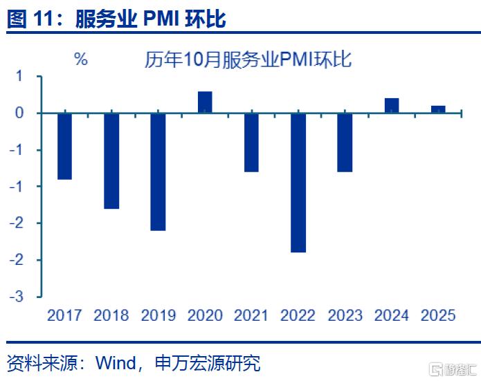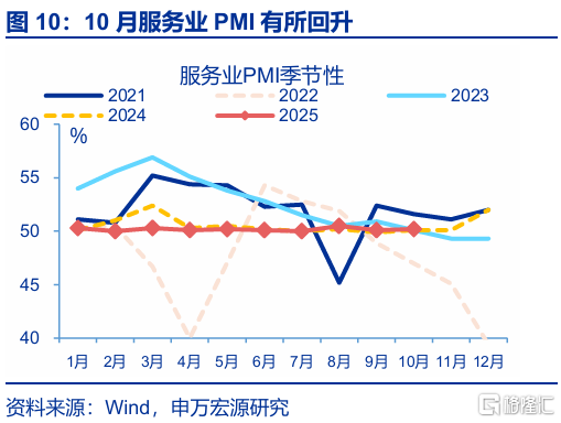 相比之下,服务业PMI有所改善,更多是假期出行以及“双十一”促销前置带动相关行业景气回升。10月,服务业PMI较前月上行0.1pct至50.4%。从行业看,在国庆、中秋节日效应带动下,与居民出行消费密切相关的铁路运输、航空运输、住宿、文化体育娱乐等行业商务活动指数均位于60.0%及以上高位景气区间;同时,受“双十一”促消费活动等因素带动,邮政业商务活动指数升至70.0%以上。