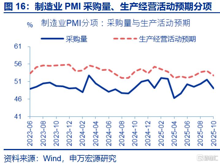 症结一:生产指数大幅回落,或源于“抢生产”效应退坡,高库存及PMI环比属性的共同影响。9月制造业存在阶段性“补库存抢生产”现象,数据上9月产成品、生产指数均有明显回升,分别较前月上行1.4、1.1pct至48.2%、51.9%;工业生产数据也有佐证,9月工业增加值增速大幅冲高,汽车等生产明显改善,或与部分地区国补暂停前企业集中“补库存抢销售”有一定关系。但是PMI为环比指标,9月生产指数冲高会从统计上约束10月进一步上行空间;同时在“抢生产”退坡叠加高库存的共同影响下,采购量(-2.6pct至49%)和生产指数下行幅度均超过新订单。