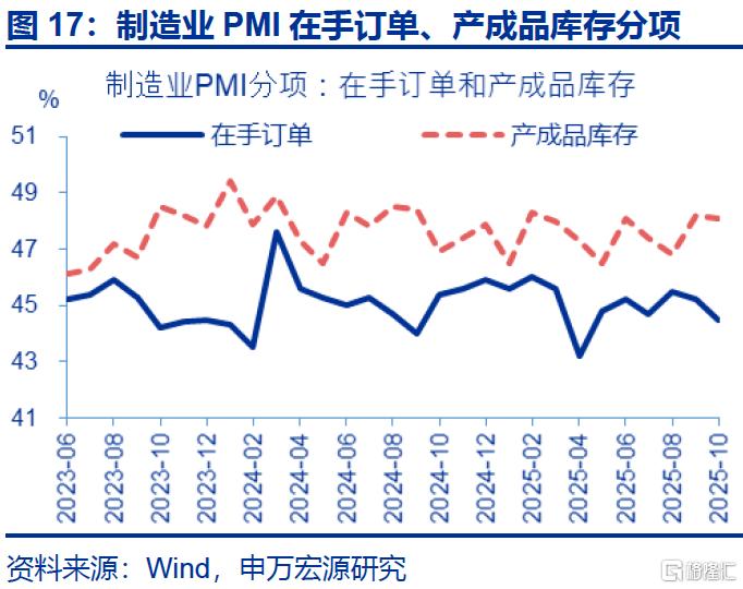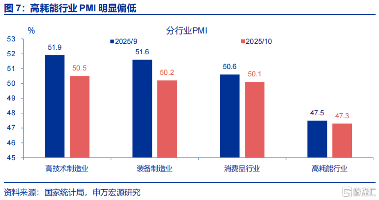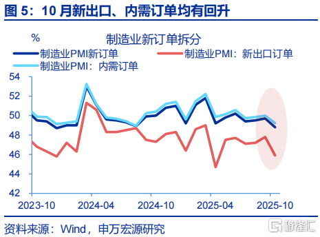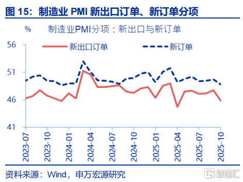 症结二:需求结构呈现内外分化特征,其中关税政策反复下,新出口订单指数降幅较大。拆分结构看,10月关税政策反复下,新出口订单指数回落幅度较大(-1.9pct至45.9%),为今年来的次低点。其中,新出口订单回落幅度较大的行业,PMI指数下滑幅度也相对明显,如高技术、消费品业新出口订单指数较前月下降3.5、2.1pct,PMI指数较前月下滑1.4pct至50.5%、0.5pct至50.1%。纺织服装、化学纤维等PMI指数均低于临界点。