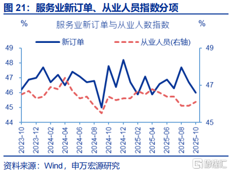 服务业:服务业PMI有所回升,从业人员指数有所回升。10月,服务业PMI环比上行0.1pct至50.2%。主要分项中,从业人员指数上行0.2pct至46.1%。