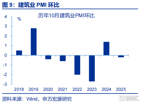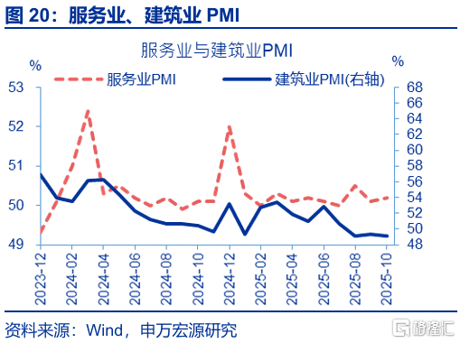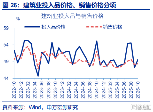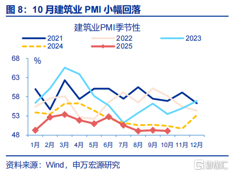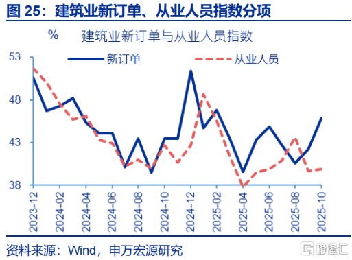 症结三:内需方面看,化债提速短期导致投资需求走弱,也相应令高耗能行业、建筑业PMI磨底。内需订单整体维持较高韧性。重点制造业中,高耗能行业PMI在47.5%的低位进一步下滑至10月47.3%,或反映化债提速对地产、基建投资需求的压制较强。同时建筑业PMI也持续位于近年同期低位,10月下滑0.2pct至49.1%。但10月以来,增量财政政策逐步落地有助于缓解投资的资金压力,建筑业业务活动预期指数回升3.6pct。