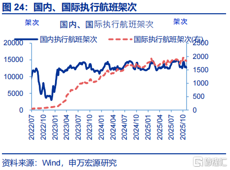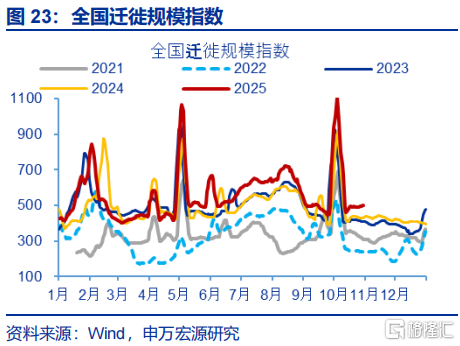 服务业中,从业人员指数明显回升。10月,服务业主要分项中,从业人员指数回升(+0.2pct至46.1%),相比之下,新订单指数回落较大(-0.7pct至46.0%)。高频数据显示,10月,全国迁徙指数同比上行14.9pct至22.4%;国内、国际执行航班架次同比均有上行,分别较前回升0.9、3pct至2.5%、13.6%。