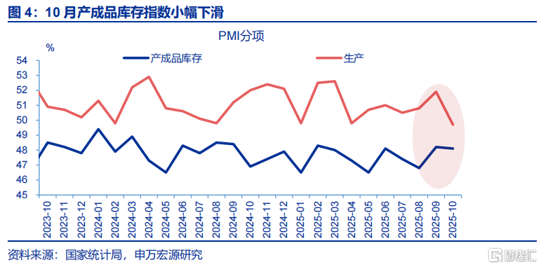 制造业生产有所回落,采购量指数明显下降。10月,新出口订单指数环比回落1.9个百分点至45.9%,进口订单指数较前月也有回落(-1.3pct至46.8%)。制造业生产减弱下,企业采购意愿下降,采购量指数环比下行2.6个百分点至49.0%。