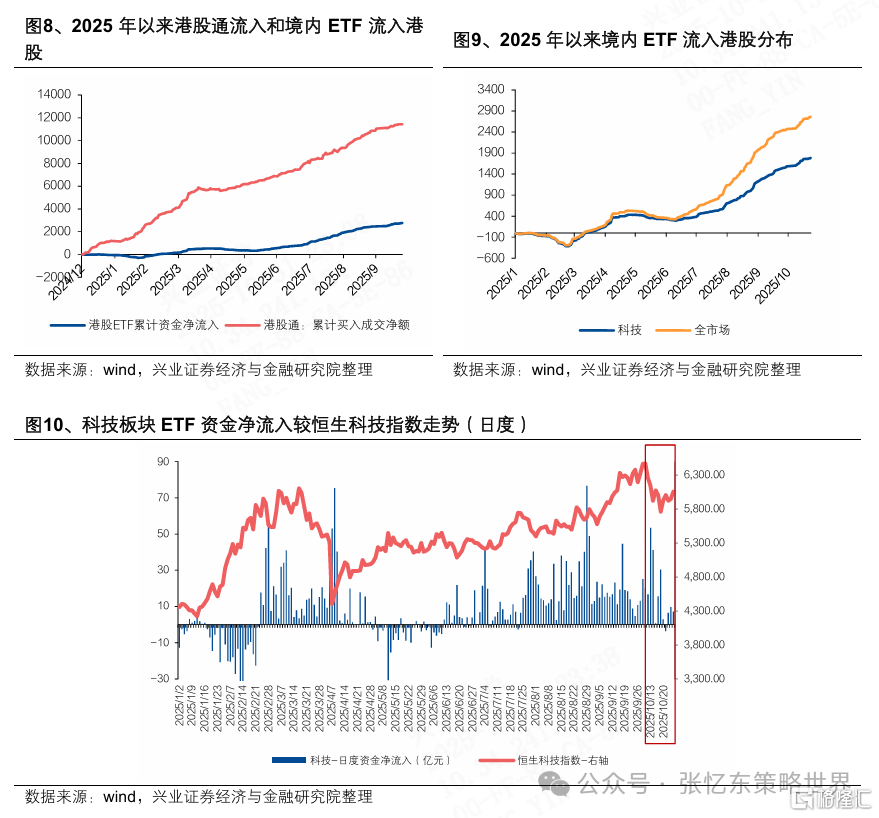 港股通,内地资金将持续流入港股。1)本轮牛市中港股通持续为港股市场提供增量资金,尤其在市场震荡期,港股通资金流入呈现出利用震荡加速布局的趋势。2)港股通ETF成为内地资金配置港股的重要承载体。2025年以来,港股通累计净流入规模已达到11438.8亿元,其中通过ETF流入的资金累计达2763.7亿元,占比超过20%。3)港股科技板块,近期内地资金积极布局,表现出较强的抄底意愿。10月8日以来,随着恒生科技指数的再次调整,流入科技相关ETF的资金也显著增加。