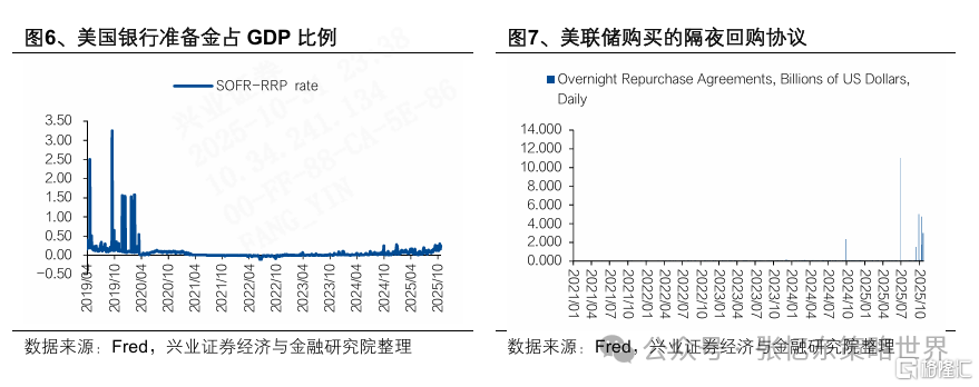 即使12月不降息,美联储也将停止缩表,这将进一步释放流动性。1)银行准备金指标逼近阈值。截至10月22日,美国银行准备金余额占GDP的比例已从2020—2021年流动性极度充裕时期的15%—18%降至9.6%,明显低于2011年以来的中位数水平(11.6%)。美联储上一轮缩表周期(2017年10月—2019年7月),当该比例降至不足8%时,美国曾爆发小型的回购市场流动性危机,因此,联储视其为QT进度的间接指标。2)市场利率信号转向偏紧。SOFR(担保隔夜融资利率)与RRP(常备逆回购利率)的利差扩大,以及美联储隔夜回购操作(Overnight Repo)上升,都显示市场流动性已不再极度宽裕,进一步支持停止缩表的必要性。