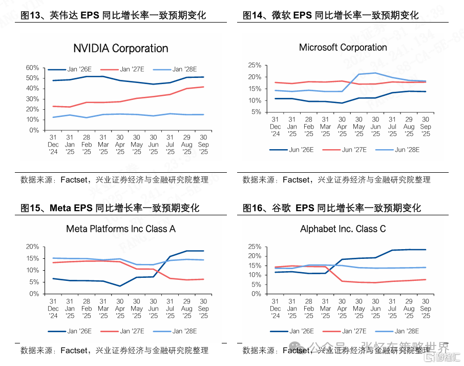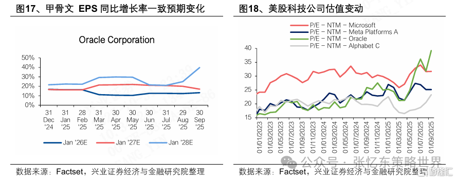 美股AI龙头企业的盈利增速预期提升,驱动估值抬升,引领美股持续走牛。相较于2024年底,截至2025年9月30日,英伟达2027财年预测EPS同比增速从23%提升到42%;甲骨文2028财年EPS预期增速从22%提升到40%;Meta 2026财年EPS预期增速从7%提升到18%。相应,当前甲骨文、Meta的动态PE从过去20倍以下的水平分别提升到了42倍和25倍。