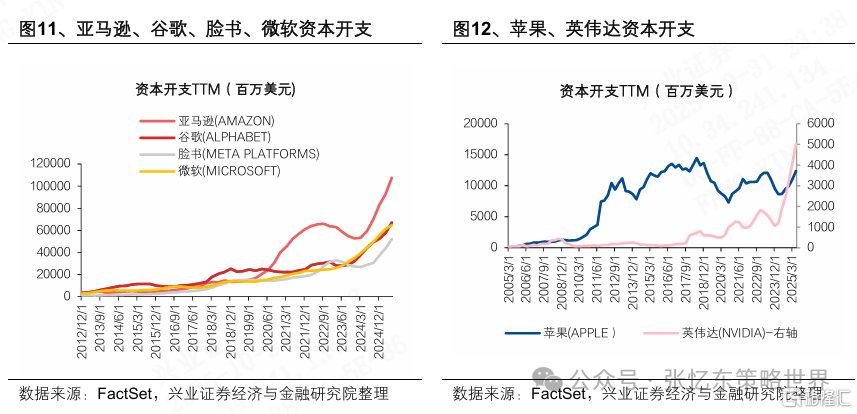自 2023 年 ChatGPT 取得突破性进展后,美股行情聚焦AI,以微软、英伟达、Alphabet、Meta等为代表的龙头公司纷纷加大资本开支。截至2025年二季度,英伟达的资本开支较2023年同期增加了2倍,微软增加了130%,Alphabet 增加了139%,Meta增加了66%。