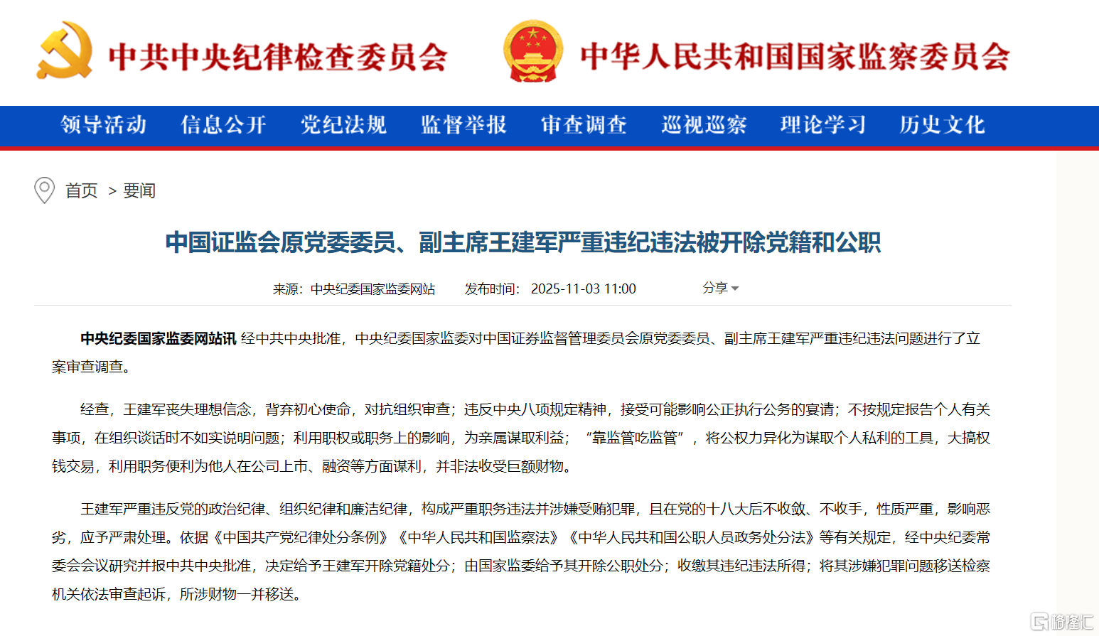 据中央纪委国家监委网站,经中共中央批准,中央纪委国家监委对中国证券监督管理委员会原党委委员、副主席王建军严重违纪违法问题进行了立案审查调查。