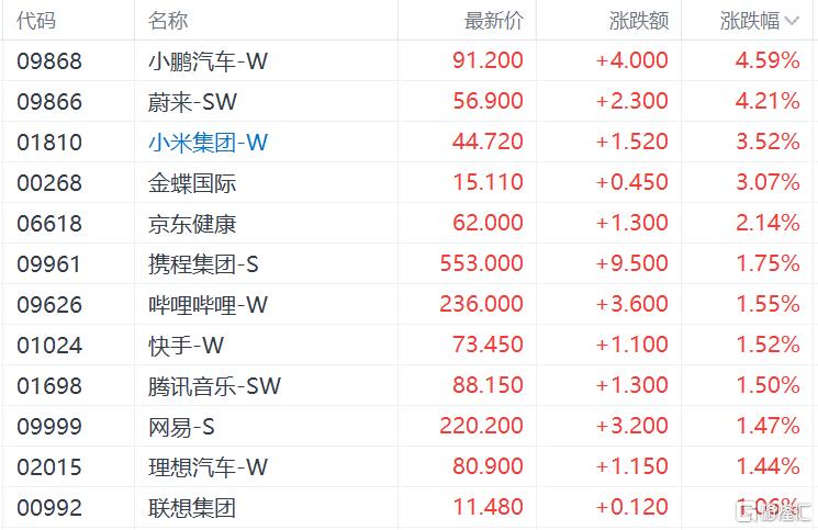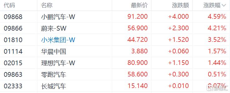 新能源汽车股普遍上涨,小鹏汽车、蔚来汽车涨超4%,理想汽车涨1.44%。