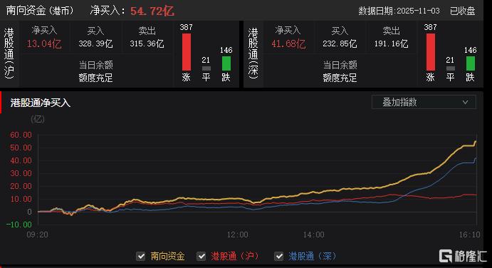 今日,南下资金净买入54.72亿港元。其中,港股通(沪)净买入13.04亿港元,港股通(深)净买入41.68亿港元。