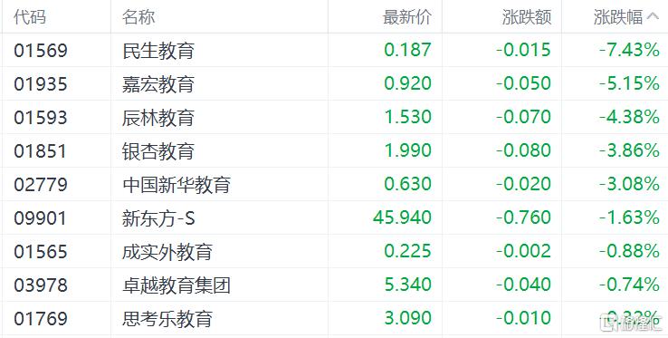 内地教育股部分飘绿,民生教育跌7.43%,嘉宏教育跌5.15%,辰林教育跌4.38%,银杏教育、中国新华教育跌超1%。