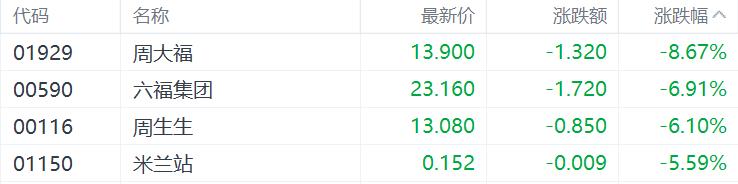 香港零售股走低,周大福跌8.67%,六福集团、周生生跌超6%。